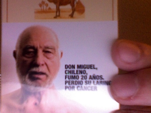 On the front of the pack, there is a picture of a man with a tracheotomy. The text reads “Don Miguel, Chilean, Smoked 20 years, Lost his larynx due to cancer”.